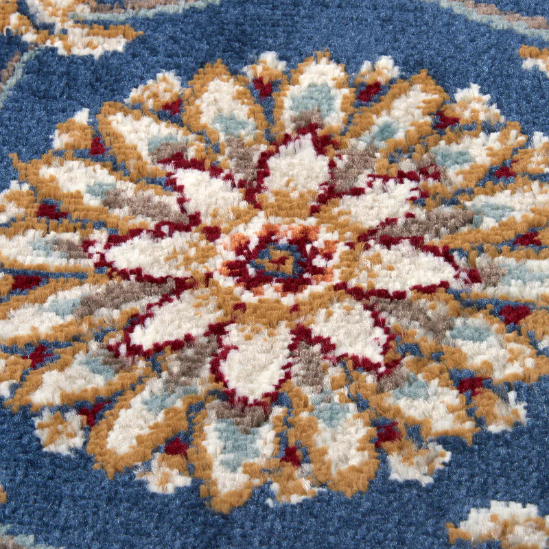De diepe blauwe kleur van dit kleed komt prachtig tot zijn recht onder een lichte hoekbank, bij houten meubels of in een zithoek met beige of crème accenten. Leg het onder een ronde salontafel voor een modern, luchtig effect of juist bij een lange bank om de ruimte optisch dieper te maken. De rijke tint werkt ook sterk in combinatie met messing, goudkleurige accessoires of warme houten elementen. Zo wordt het centrale kleuraccent dat je hele interieur samenbrengt.